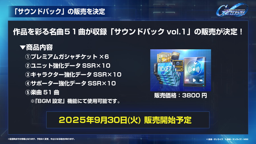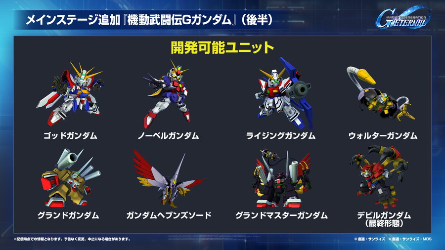 バンダイナムコエンターテインメントは、『SDガンダム ジージェネレーション エターナル』で、メインステージに「機動戦士ガンダムUC[ユニコーン]」と「機動武闘伝Gガンダム 後半」を新たに追加した。