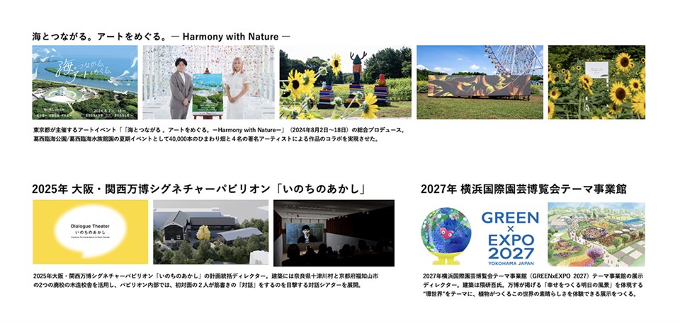 2024年新領域株式会社を設立。2025年大阪・関西万博シグネチャーパビリオン「いのちのあかし」計画統括ディレクター、2025年東京都主催アートイベント「海と自然と、いのちとつながる。―Connect with Everything―」プロデューサー、2027年「GREEN×EXPO 2027」テーマ館 展示ディレクター等を務め、アートとテクノロジーを横断しながら新たな体験と空間の創造に取り組んでいる。