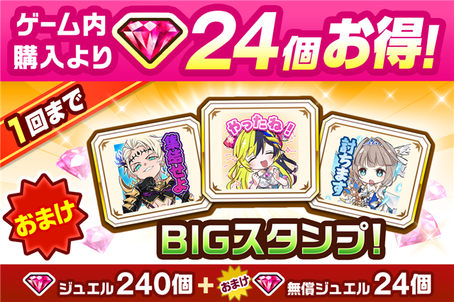 内容物:「ジュエル」240個、「無償ジュエル」24個、「BIGスタンプ」3個、「EXルーン」2個