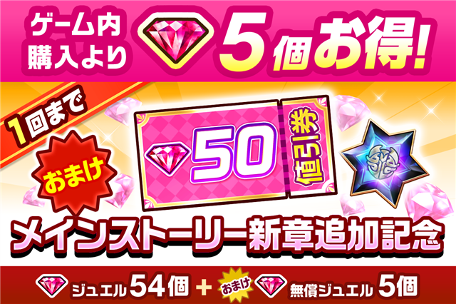 内容物:「ジュエル」675個、「無償ジュエル」65個、「新イベントキャラ保証」など