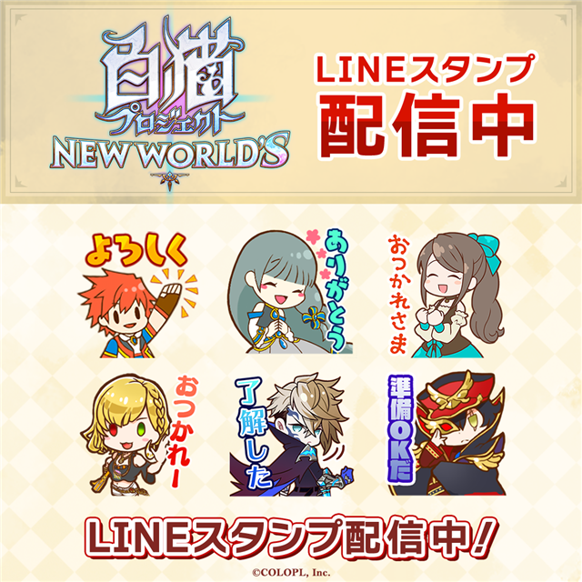 コミュニケーションアプリ「LINE」でご利用いただける「LINEスタンプ」が配信中。『白猫』の協力バトルで使用可能なスタンプと同じデザインとなっている。日々のお友達とのコミュニケーションに、ぜひご活用ください。また、後日「LINE着せかえ」の販売も予定しているので、楽しみにお待ちください。