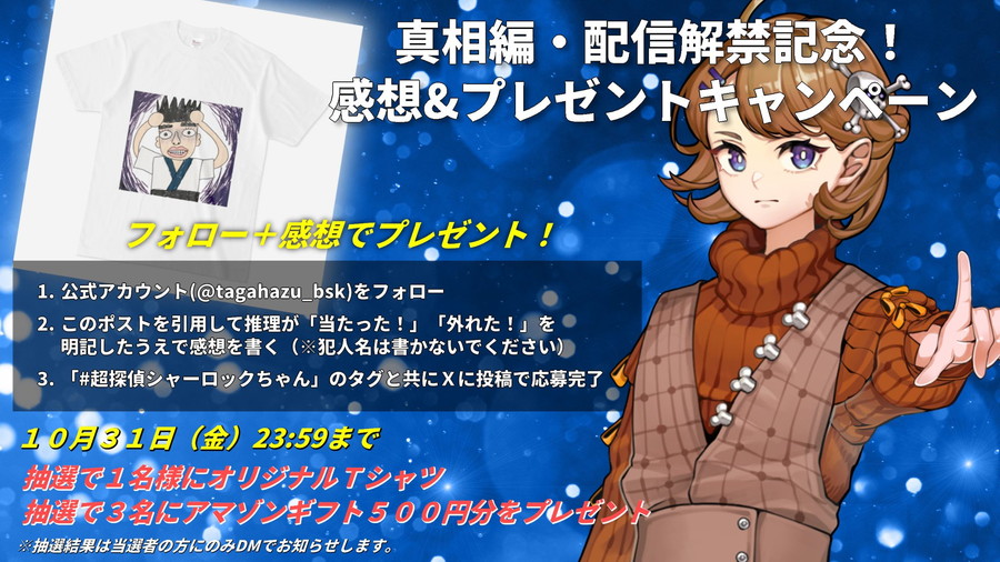 X公式アカウントをフォローし、10月1日に投稿される該当ポストを引用して推理の感想(犯人名以外)とハッシュタグ「#超探偵シャーロックちゃん」を付けて投稿。