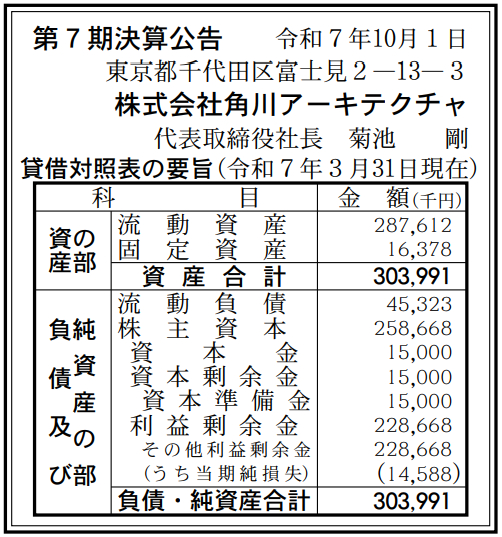 角川アーキテクチャが解散した。10月1日付の「官報」に掲載された「解散公告」によると、株主総会の決議により9月30日をもって解散したとのこと。第7期決算公告も掲載されており、最終赤字は1400万円だった(前の期は1500万円の黒字計上)。