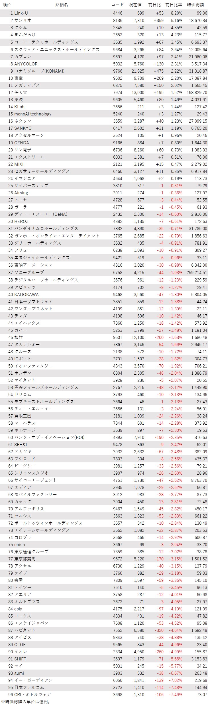 そうした中でゲーム・エンタメ関連株の動きを見てみると、下記の表に登録しているゲーム・エンタメ関連企業96銘柄のうち、上昇は24銘柄(25%)、下落は72銘柄(75%)、変わらずは0銘柄(0%)で、下落した銘柄の方が多かった。