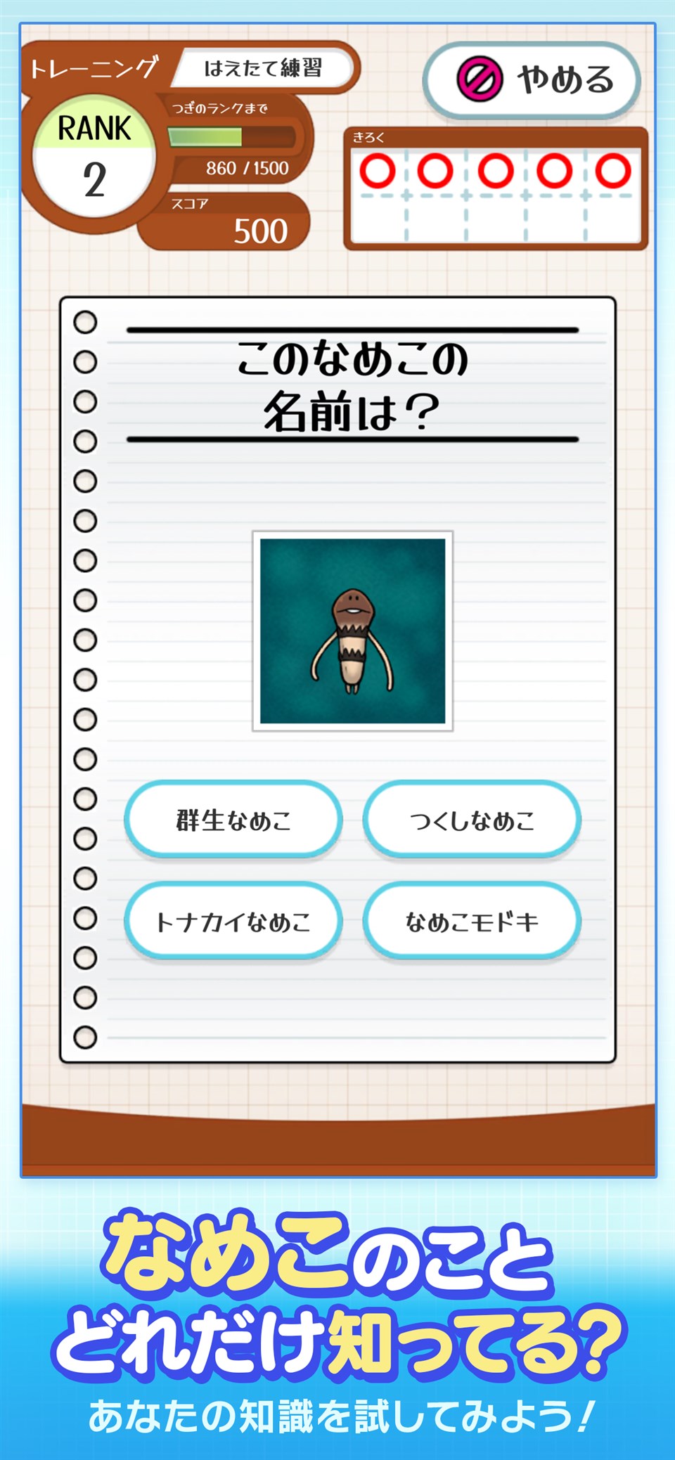 トレーニングで⾃信がついたら、なめこ検定にチャレンジして実⼒を試してみよう。⾒事合格すると、博⼠ランクが上がって新しい問題に挑戦できるようになる。出題される問題はどんどんマニアックになっていくので、やりごたえ抜群だ。最⾼ランクの「マスター博⼠」を⽬指してみよう︕
