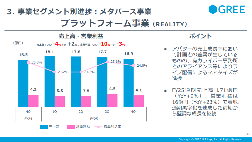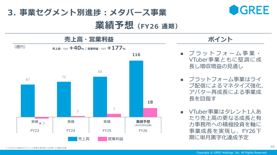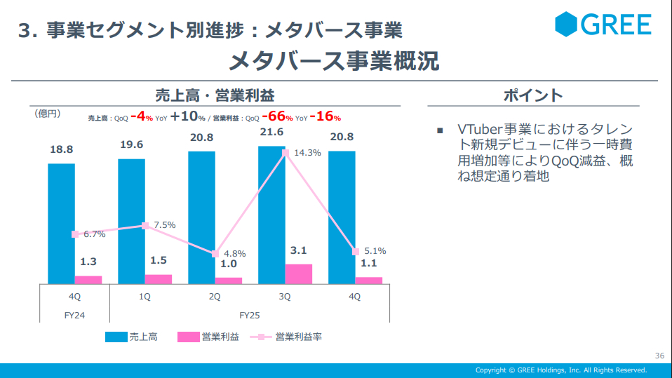 同社は、国内最大級の"人がいるメタバース"「REALITY」の開発・運営を行っている。親会社によると、「REALITY」のコンテンツ拡充と機能拡充を進めるとともに、グローバル展開を進めてきたとのこと。また、費用効率化による収益構造の改善にも取り組み、損益が大きく改善したという。同時に、VTuber事業における積極的な投資もこなして大幅増益となった。