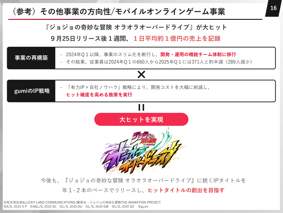 同社では、モバイルオンラインゲームについてはリストラによるコスト構造の改革に加えて、新作『オラドラ』の大ヒットで業績向上に向けた収益基盤の構築が完了した、としている。精鋭チームによる開発・運営と「有力IP×自社ノウハウ」戦略の実行で大ヒットを実現したという。