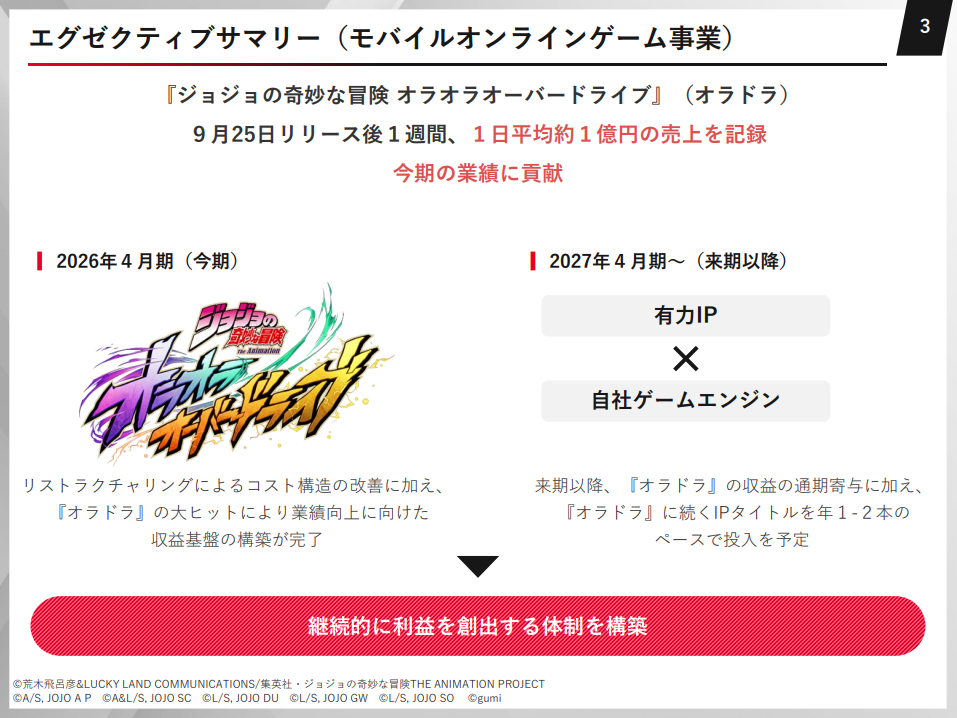 gumi<3903>は、この日(10月2日)、『ジョジョの奇妙な冒険 オラオラオーバードライブ(オラドラ)』について1日平均1億円の売上を記録するなど大ヒットしていると明かした。9月25日にリリースしたばかりの新作だが、順調な立ち上がりとなっており、2026年4月期の業績にも貢献する見通し。