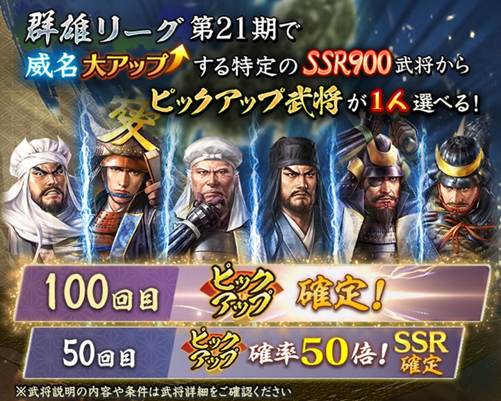 群雄リーグ開催に合わせ、対象の上杉家SSR初期威名900武将の中から1名をピックアップ武将として選択できる特別登用。SSR【軍神】上杉謙信やSSR【越後流軍学】宇佐美定満などが選択できる。