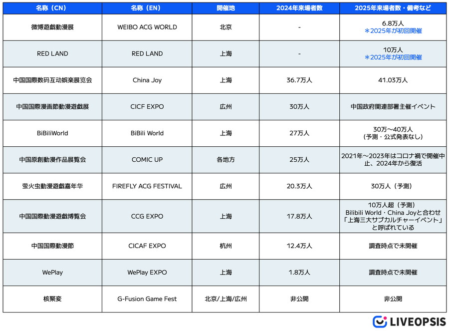 ※スパイスマート調査|中国ゲーム・アニメ関連展示会・イベント一覧(2024年来場者数 降順)