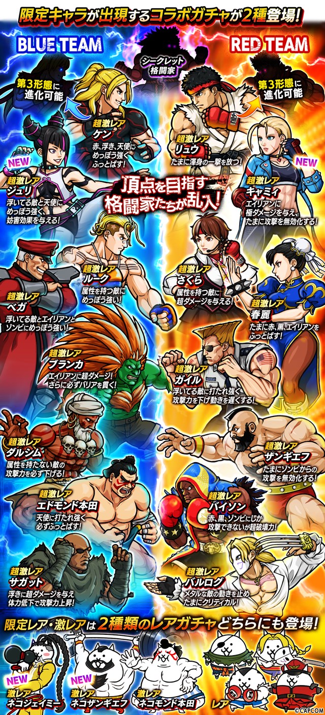 コラボ限定キャラクターが出現する「ストリートファイター6」ガチャをBLUE TEAM、RED TEAMの2種類に分けて開催する。新たに超激レアキャラクター「ジュリ」「キャミィ」に加え、激レアキャラクター「ネコザンギエフ」「ネコジェイミー」が追加された。「ジュリ」はBLUE TEAMガチャ、「キャミィ」はRED TEAMガチャ、「ネコザンギエフ」「ネコジェイミー」はどちらのガチャからも登場する。前回同様、シークレット格闘家も登場する!?