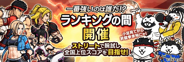 ネコ道場「ランキングの間」にてコラボ期間限定のランキングイベント「俺より強いやつに会いに行く」を開催する。「ストリートファイター」のキャラクターが多数登場する腕試しイベントとなっている。