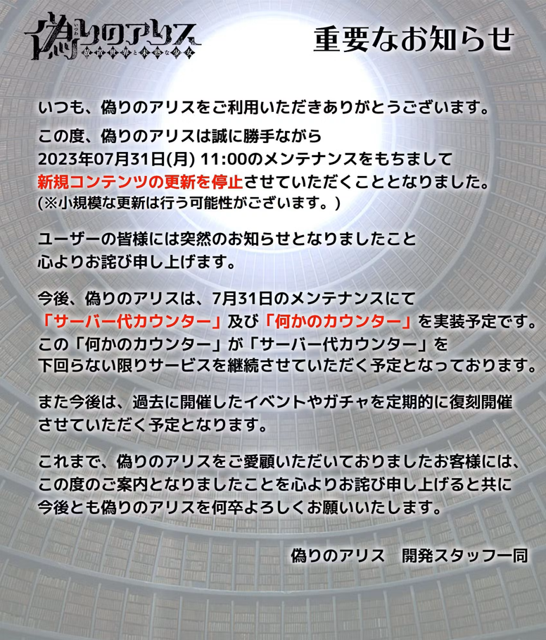 偽りのアリスは2023年8月をもって新規コンテンツの更新を停止し、課金額がサーバー代を下回らない限り、サービスを継続する運営へと切り替えました。