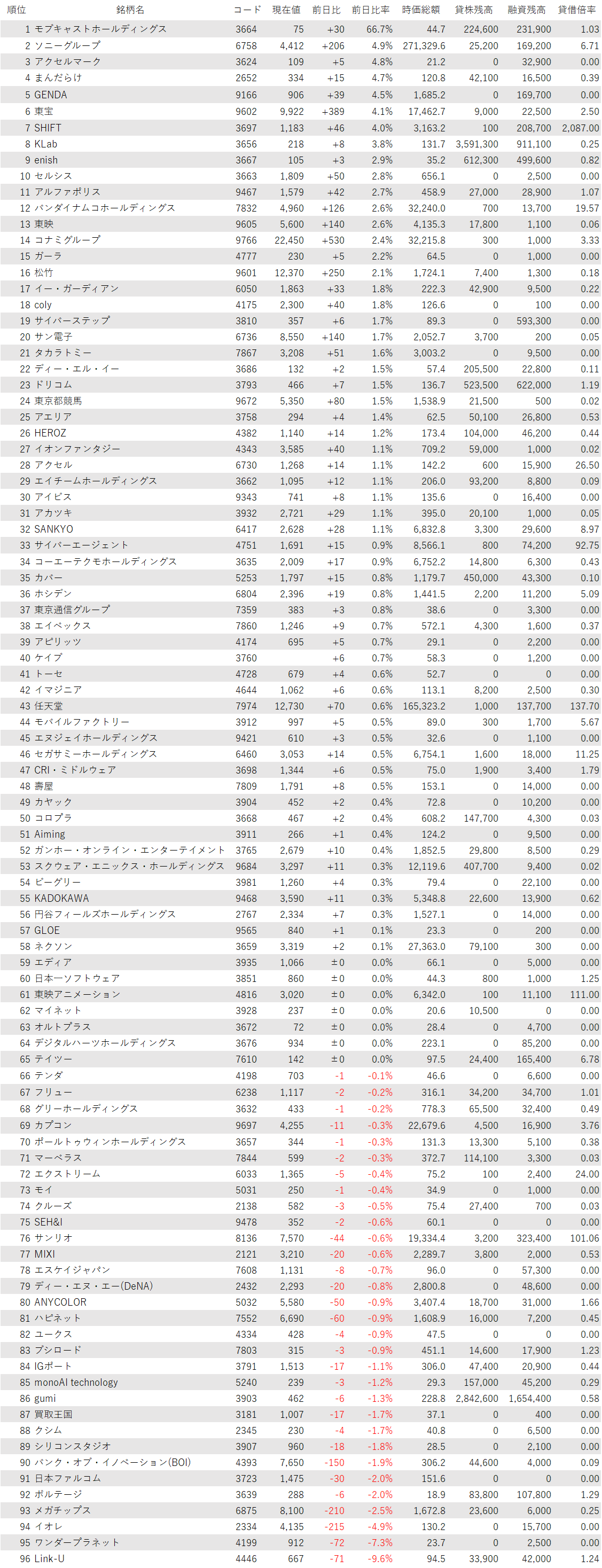 こうしたなか、ゲーム・エンタメ関連企業をみると、登録されている96銘柄のうち、上昇は58銘柄(60%)、下落は31銘柄(32%)、変わらずは7銘柄(7%)で、買い優勢だった。全体相場の活況ぶりに比べて動きの鈍い銘柄が目立っている。