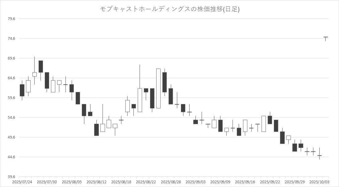 最後に騰落ランキングを見ると、新たに暗号資産「ソラナ」を活用したソラナ・トレジャリー事業を開始すると発表したモブキャストHD<3664>がストップ高まで買われたほか、ソニーG<6758>、アクセルマーク<3624>、まんだらけ<2652>が値上がり率上位となり、Link-U<4446>、ワンダープラネット<4199>、イオレ<2334>、メガチップス<6875>が値下がり率上位となった。