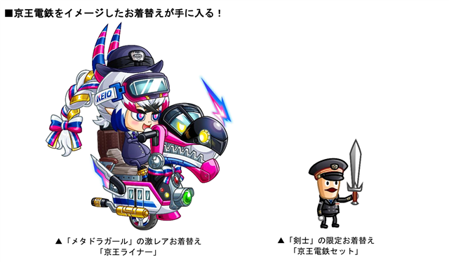 「京王電鉄のアバたま」に城ドラキャラのコラボ限定激レアお着替えとして、メタドラガールの「京王ライナー」が登場!さらに限定の剣士お着替え「京王電鉄セット」も登場する。アバたまを割って、コラボ期間中にしか手に入らない限定お着替えを手に入れよう!