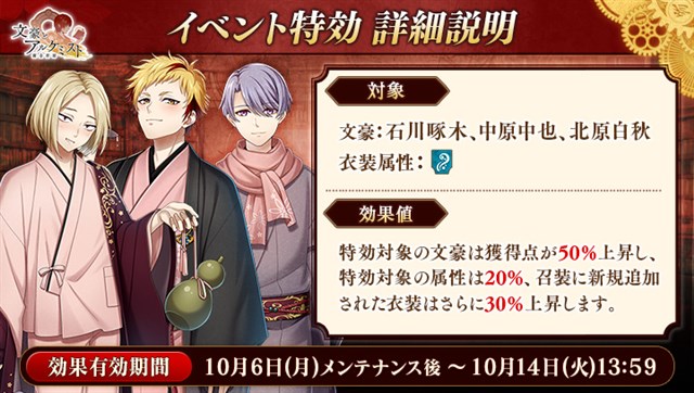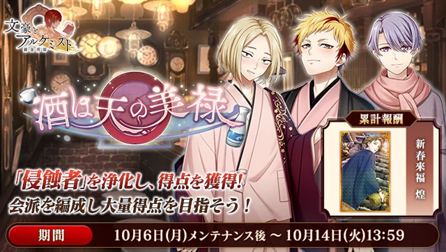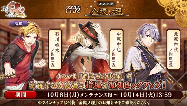 EXNOAが運営するDMM GAMESは、『文豪とアルケミスト』において、10月6日より、若山牧水の新たな「覚醒ノ指環」を追加した。また、イベント『特殊調査任務「酒は天の美禄」』と限定召装『酒は天の美禄』を開始した。さらに、召装『金ノ理』のラインナップを更新した。