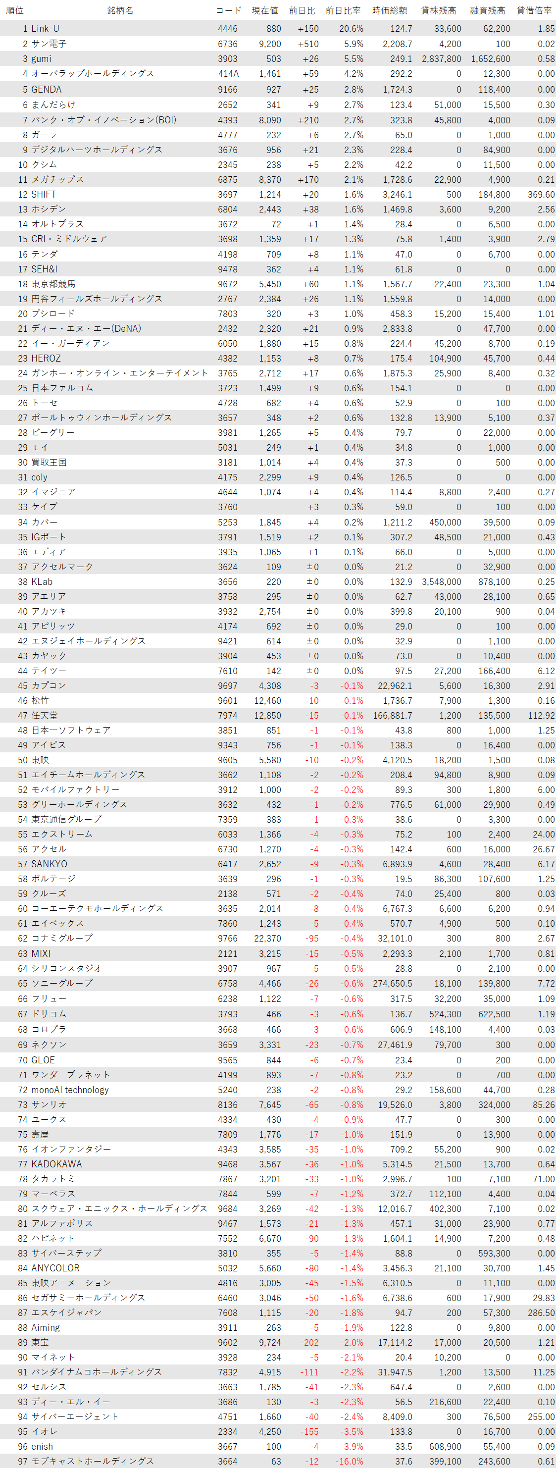 こうしたなか、ゲーム・エンタメ関連企業をみると、登録されている97銘柄のうち、上昇は36銘柄(37%)、下落は53銘柄(55%)、変わらずは8銘柄(8%)だった。個別物色は行われているものの、エンタメ系は総じて引き続き売り優勢だった。