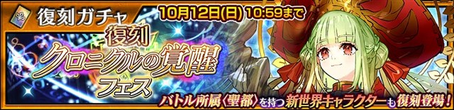 10月2日に共鳴必殺が超共鳴必殺に変更されるなどの上方調整が行われた「クロニクルの覚醒【祈りの聖女】リリス」が登場する“ 【復刻】クロニクルの覚醒フェス”を実施予定。リリスは、発動と同時に対象キャラクターに特別な効果を与える「共鳴必殺」「共鳴アビリティ」や〈バトル所属〉に加えて、「マナの最大所持枠が増える」、「ボスWAVE中にピリカが持ってくるマナに特殊なものが追加される」という特別なアビリティを持っている。また、リリスをパーティのリーダーもしくは1stに設定すると、バトルのBGMが変化する。さらに、こちらのフェスからは「奈落の世界《哀別者》 シエラスエス」「潜艦の世界《希望の救援班長》 ユリアナ」「謀略の世界《オルタナティブ》 ルイーゼ」も復刻登場する。