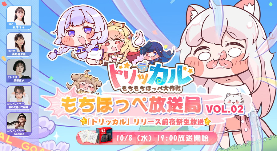 さらに、ゲームの正式リリースを記念して、本日10月8日19時より、高野麻里佳さん、塚田悠衣さんらが出演するリリース直前生放送が公式YouTubeチャンネルと公式Xを開催する。この生放送では豪華特典も用意されており、Switch2が当たるチャンスもある。