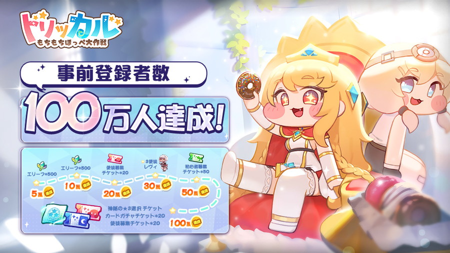 事前登録者数が100万人を突破し、全ての報酬がアンロックした。これにより、ログイン初日に130連ガチャのチャンスと、ゲーム内★3キャラクター2体、エリーフなどのアイテムを獲得できる。