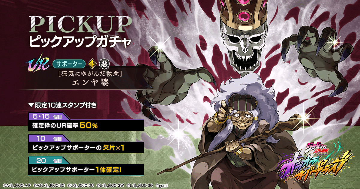【狂気にゆがんだ執念】エンヤ婆をピックアップしたガチャを開催。10連ガチャでSR以上のユニットまたはサポーターが1枠確定で登場する。さらに、スタンプ20個目でピックアップサポーター1体がもらえる限定ガチャ10連ガチャスタンプ付きだ。