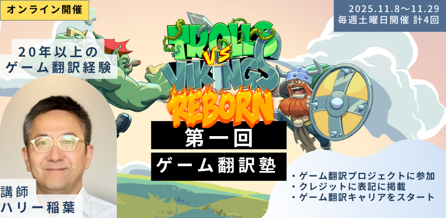 ゲームごとに異なる翻訳スタイルが求められるゲーム翻訳。本講座では座学だけでは得られない知識やノウハウを、実際のPCゲーム『トロールVSヴァイキング:リボーン』を題材に実際のゲーム翻訳プロジェクトに参加し、塾長や仲間の受講者と共に本ゲームにぴったりハマる翻訳スタイルを模索し、皆で共通のスタイルで翻訳することを目標に担当箇所の翻訳を実際に担当。