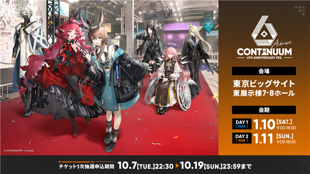 6周年を記念したリアルイベント『アークナイツ 6th Anniversary Fes.「Continuum」』を2026年1月10〜11日に東京ビックサイト東展示棟 7・8 ホールにて開催する。会場では、展示、アトラクションなどの場内施策に加え、ステージイベントを実施予定。詳しくは公式サイトで確認できる。