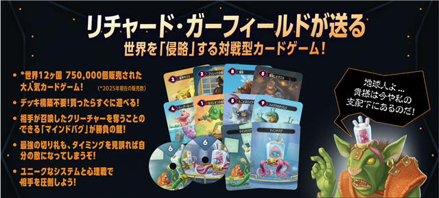 『MINDBUG(マインドバグ)』は、『マジック:ザ・ギャザリング』の作者であるリチャード・ガーフィールドが送る“切り札強奪カードゲーム”。2人用でカード収集・デッキ構築なしで濃密な戦略バトルを楽しめる。世界12ヵ国で販売された人気作となっており、2023年ドイツ年間エキスパートゲーム大賞のノミネート作品でもある。たった10枚で勝敗が決まる濃密な駆け引きに、 相手のカードを奪う「マインドバグ」を使って逆転の一手を狙おう!