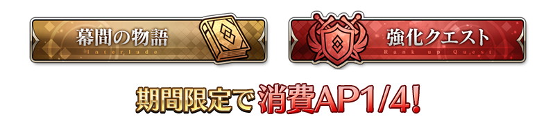 下記の期間中、すべてのサーヴァントの「幕間の物語」と「強化クエスト」の消費 AP が1/4になる。(バトルにおいて撤退した場合でも、同様の消費量になる)