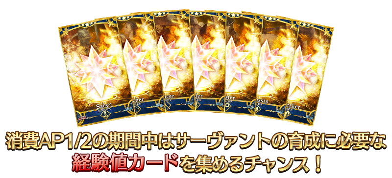 下記の期間中、メインストーリーのすべてのフリークエストの初回クリアまでの消費 AP が1/2になる。(バトルにおいて撤退した場合でも、同様の消費量になる)