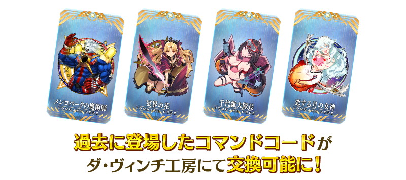 ダ・ヴィンチ工房の「レアプリズムを交換」に、過去の期間限定イベントで登場した★5 (SSR)コマンドコード4種を恒常的に追加する。
