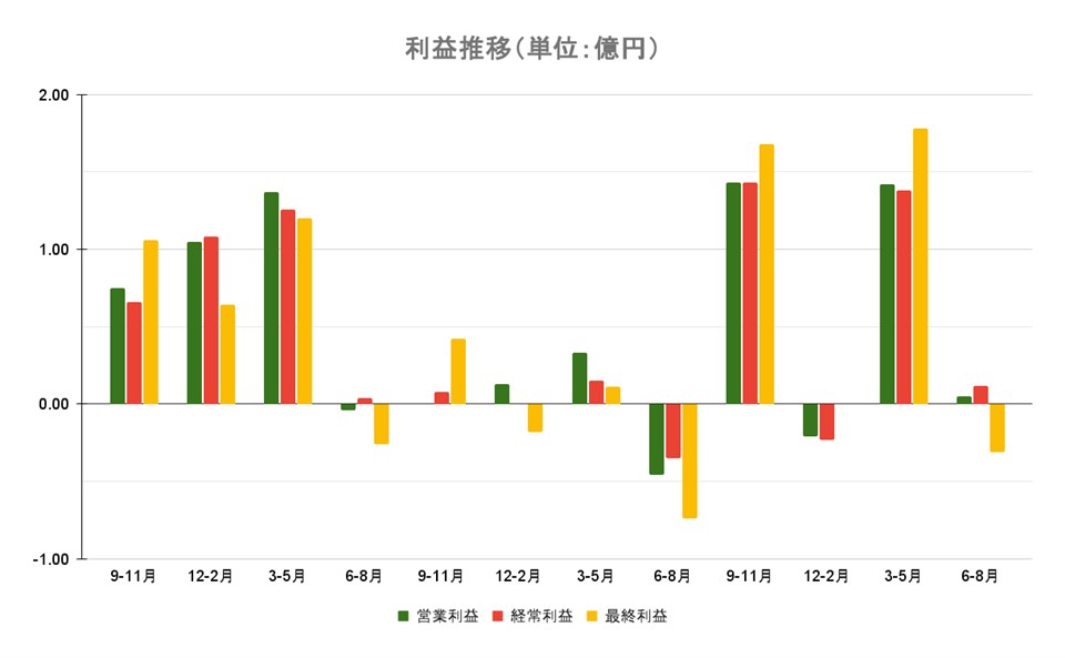 - 売上高44億1400万円、営業利益1億4300万円、経常利益1億2300万円、最終利益8700万円(2024年11月期)