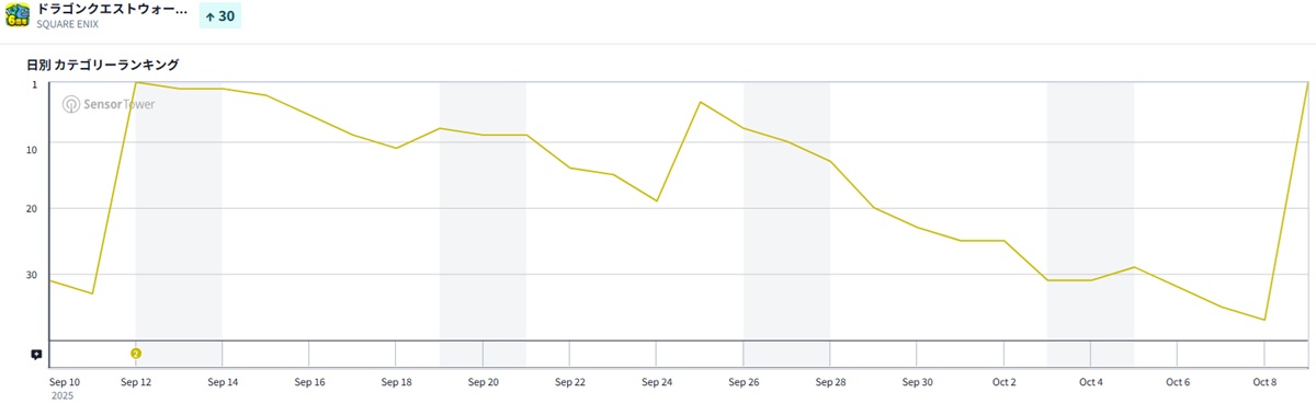 10月10日9時現在のApp Storeセールスランキング(ゲームカテゴリー)は、スクウェア・エニックスの『ドラゴンクエストウォーク』が36ランクアップで首位を獲得した。