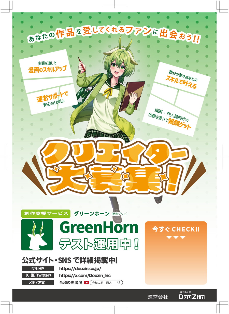 「GreenHorn」は、漫画・同人誌などのクリエイティブ分野で、依頼者とクリエイターが安心して制作を進められる掲示板型マッチングサービス。権利保護、支払いの明確化、進行管理を備え、個人クリエイターでも安全に取引できる仕組みを提供している。