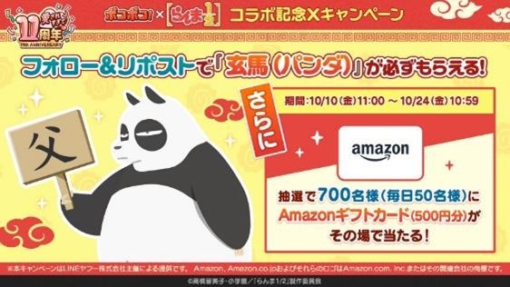 『LINE ポコポコ』の公式X(旧Twitter)アカウントをフォローしてキャンペーンポストをリポストすると、「Amazonギフトカード 500円分」やコラボ仲間「玄馬(パンダ)」など豪華賞品が抽選で当たる。