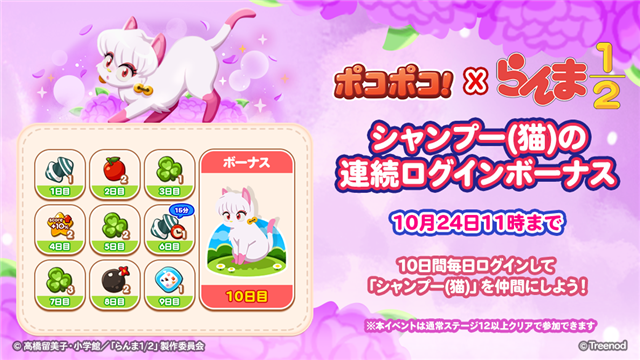 『LINE ポコポコ』に10日間連続でログインすることでコラボオリジナル仲間「シャンプー(猫)」をプレゼントする。
