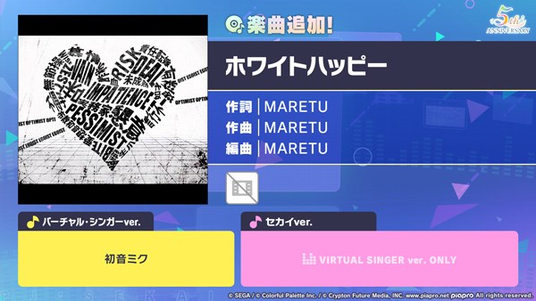 セガとColorful Paletteは、iOS/Android向けリズム&アドベンチャー『プロジェクトセカイ カラフルステージ! feat. 初音ミク(以下、プロジェクトセカイ)』において、10月10日より、「5周年記念楽曲追加キャンペーン」として新たに「ホワイトハッピー」(作詞・作曲:MARETU)をリズムゲーム楽曲に追加した。