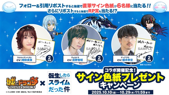 コラボ開催を記念して、「コラボ開催記念!サイン色紙プレゼントキャンペーン」を実施する。『城とドラゴン』公式Xアカウント(@shirotodoragon)をフォローし、キャンペーン対象ポストを公式リポスト、またはハッシュタグ「#城ドラ転スラコラボ」をつけて引用リポストされた方の中から抽選で各賞品をプレゼント!ぜひ引用リポストする際はハッシュタグとあわせて、「コラボイベントが発表された時の感想」や「コラボイベントの楽しみにしているポイント」などもコメントしてみよう。