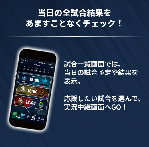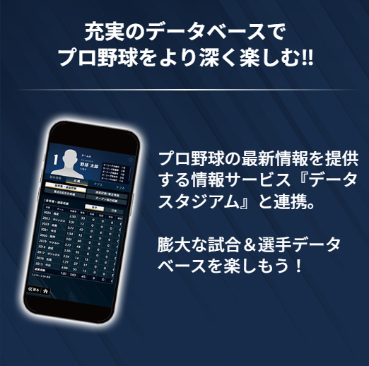 アプリでは、プロ野球の試合速報と連動した応援モードを搭載し、"試合速報連動型"アプリとして展開。ファミスタ風の映像で試合速報がリアルタイムで観戦できる機能に加え、全試合をAIボイスによる音声実況付きで無料配信し、各チームを応援したプレイヤーのスコアをランキング形式で表示。選手データや成績など膨大なデータベースにもアクセスでき、野球ファンなら誰もが熱くなれる要素が詰まっている。