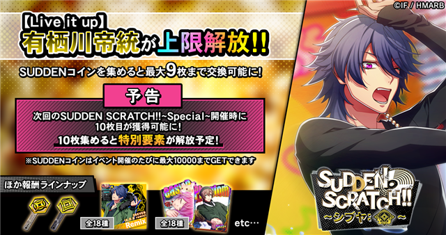 イベント期間中、KILLER SCRATCH!!をプレイするとライズ消費量に応じた確率でSUDDEN SCRATCH!!が発生する。SUDDEN SCRATCH!!をプレイすると、通常の報酬アイテムの他、限定アイテム「SUDDENコイン」を獲得することができる。「SUDDENコイン」を集めることで、「A.R.B remix」楽曲やレイズキー、シブヤ・ディビジョンのデコステッカーに使えるブースターなどと交換することが可能。また、ストーリーカード「SSR【Live it up】有栖川帝統」が上限解放され、最大9枚まで獲得できる。