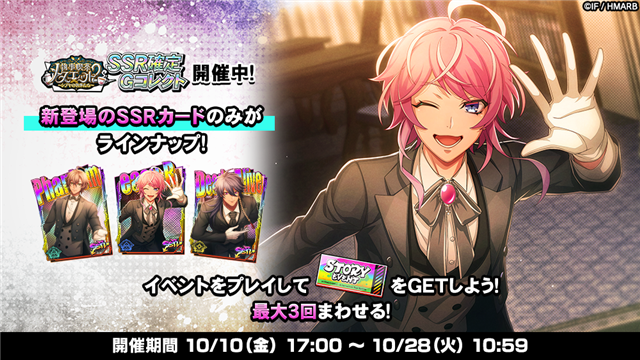 専用のGコレクトチケット「SSR確定:ストーリーイベント 後編」を使用することで回せるSSR確定のGコレクトを開催する。新たに登場した「SSR【当家のカワイイ担当】飴村乱数」「SSR【当家の創作担当】夢野幻太郎」「SSR【当家の意外性担当】有栖川帝統」のいずれかを獲得することができる。「SSR確定:ストーリーイベント 後編」はイベントアイテムと交換するほか、イベントチケット(緑)を手に入れ「執事喫茶メヌエット2~シブヤの執事たち~ 報酬BOX Gコレクト」を回すことで、最大3枚まで入手可能。