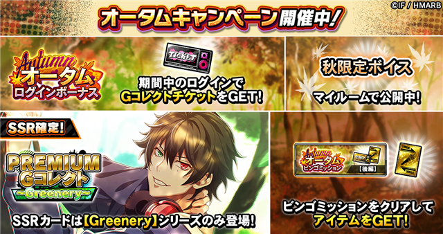 期間中、ビンゴミッションやログインボーナスを開催しているほか、マイルームでは「秋」に関するボイスを公開中。