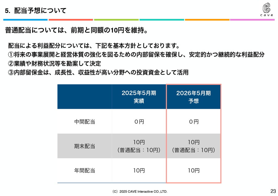 なお、2026年5月期の業績予想は非開示だが、年間配当は前期と同額の10円を予定しており、株主還元を維持する方針だ。業績予想については、合理的な業績見通しが可能になった時点で速やかに開示するとのこと。