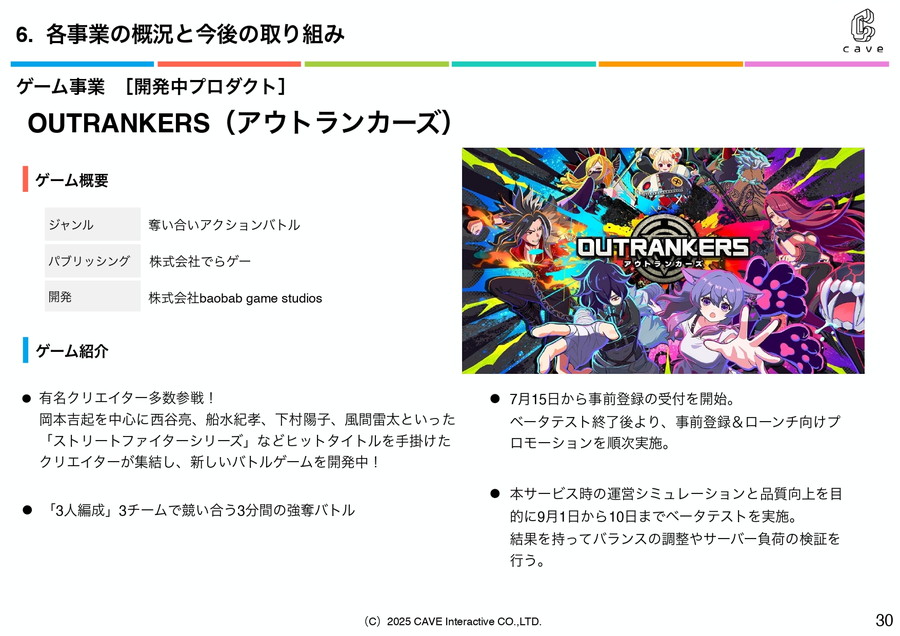 一方で、開発中の新作『OUTRANKERS(アウトランカーズ)』は、著名クリエイター陣を起用した奪い合いアクションバトルゲームとして注目を集めている。7月に事前登録を開始し、9月にはベータテストを実施。2025年の正式リリースを予定している。