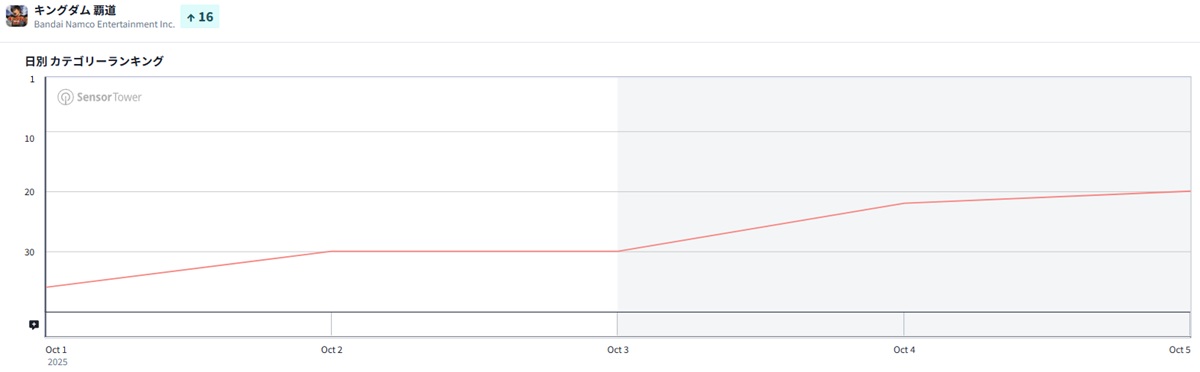 10月3日にトップ30にランクインしたバンダイナムコエンターテインメントの新作『キングダム 覇道』が、この日も順位を上げて20位に浮上した。