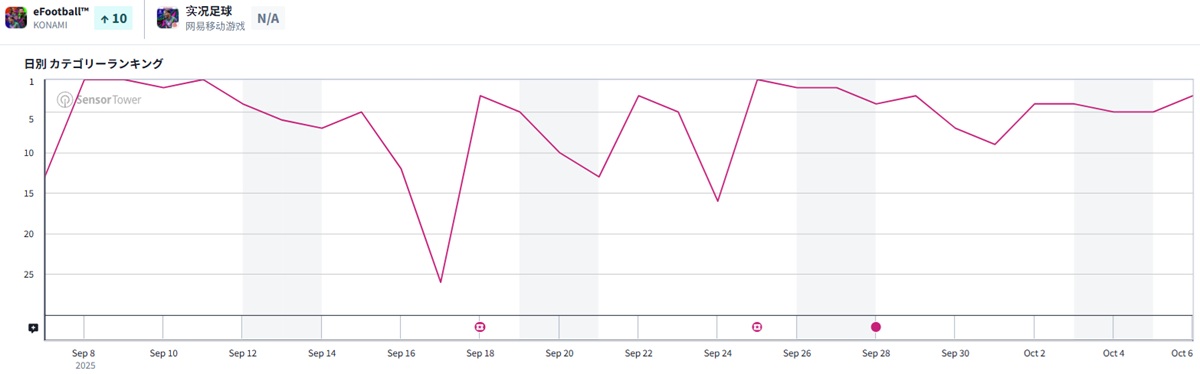 上位陣を見ると、コナミデジタルエンタテインメント(KONAMI)のサッカーゲーム『eFootball』がトップ3に入っている。