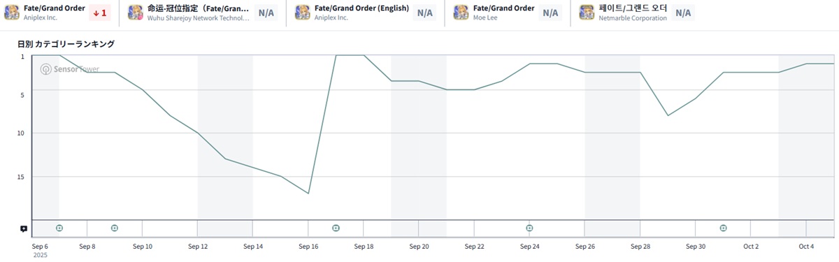 『ポケポケ』を追って2位に浮上したのは、FGO PROJECTの『Fate/Grand Order』。『FGO』は10 月 4 日から、「冠位戴冠戦:Assassin」開幕直前キャンペーンを開催。それに合わせて期間限定サーヴァントを含むアサシンクラス 32 騎をピックアップする 13 種類の召喚『「冠位戴冠戦:Assassin」ピックアップ召喚』(本召喚)を実施している。