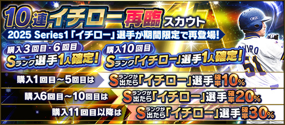 10月8日より、「[伝説の始まり]イチロー」が新たに出現し、ステップ4回目で「SR」以上の「[伝説の始まり]イチロー」が確定で出現するループガチャ「[伝説の始まり]イチロー デビュー」など球界のレジェンド選手イチローさんとのコラボレーションを開始しているほか、先週から開催中の松井秀喜さんが登場するレジェンドコラボ第2弾も引き続き行われている。