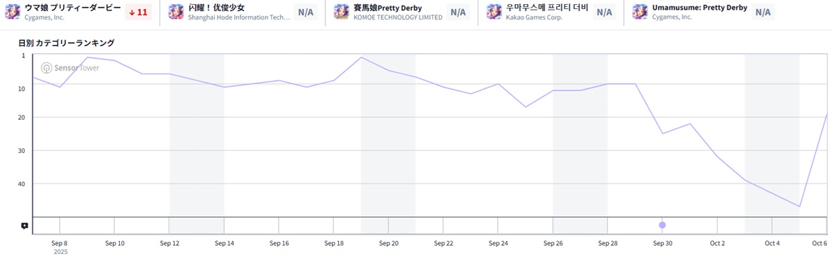 47位から19位に浮上したのは、Cygamesの『ウマ娘 プリティーダービー』。
